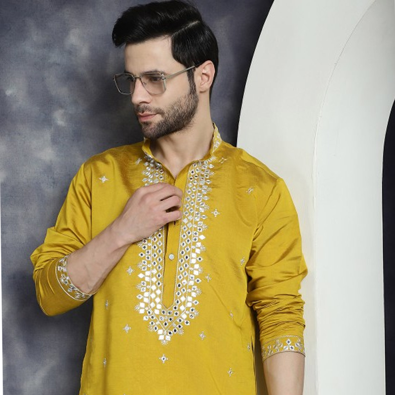 Geometric Embroidered Mandarin Collar Mirror Work Cotton Silk Straight Kurta