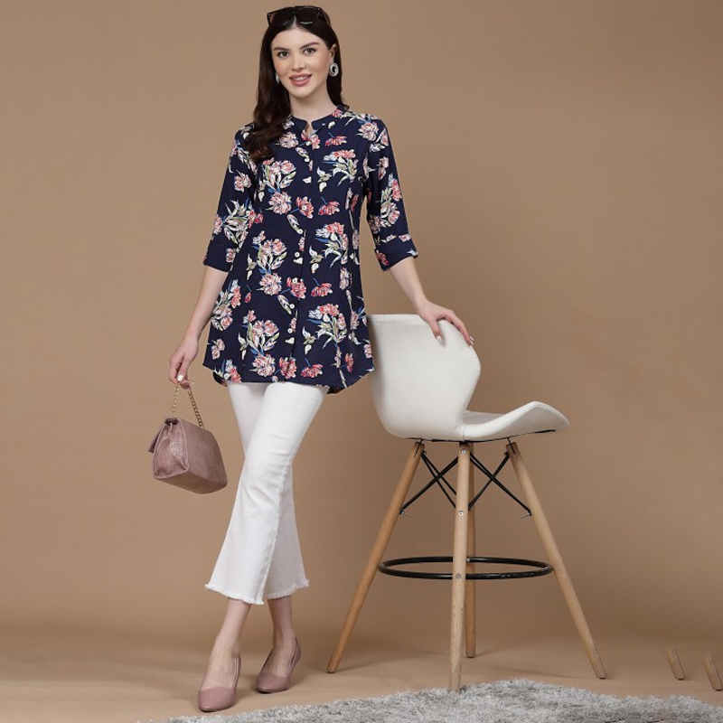 Navy Blue Floral Printed Mandarin Collar Shirt Style Tunic