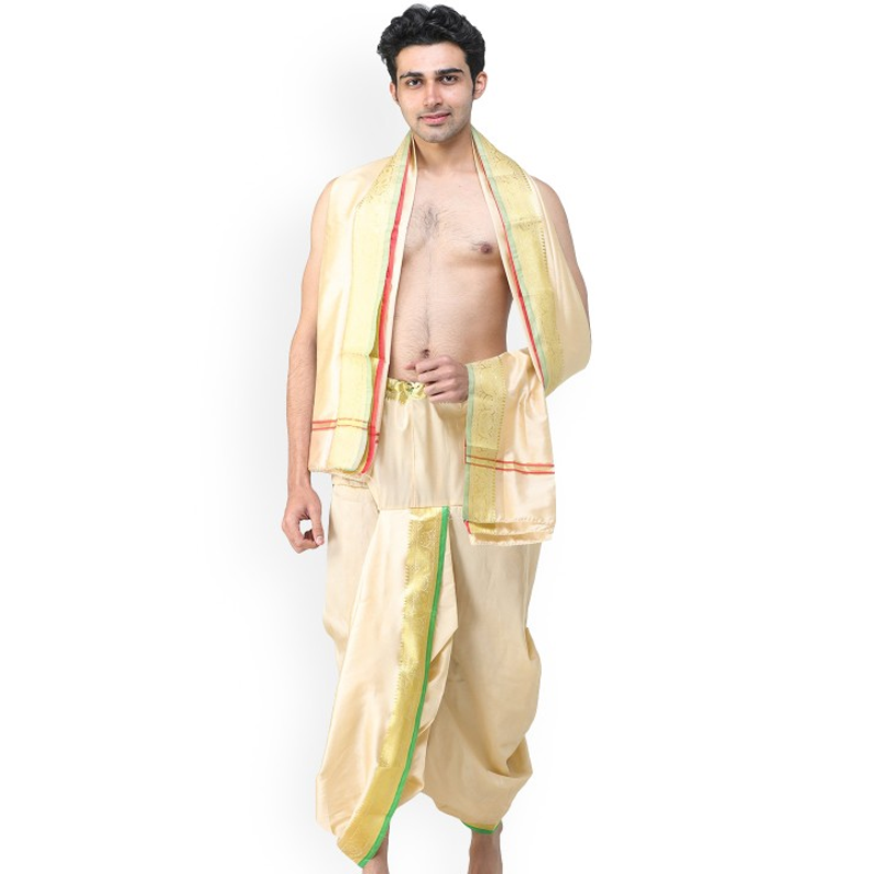 Ready to Wear Dhoti and Angavastram Set with Woven Golden Leaves Border