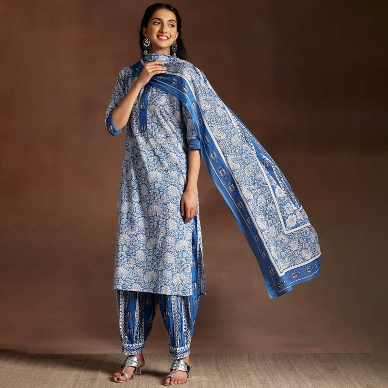 Geometric Printed Pure Cotton Straight Kurta With Salwar And Dupatta