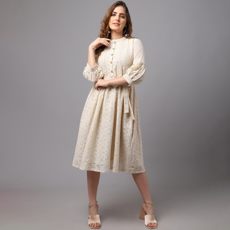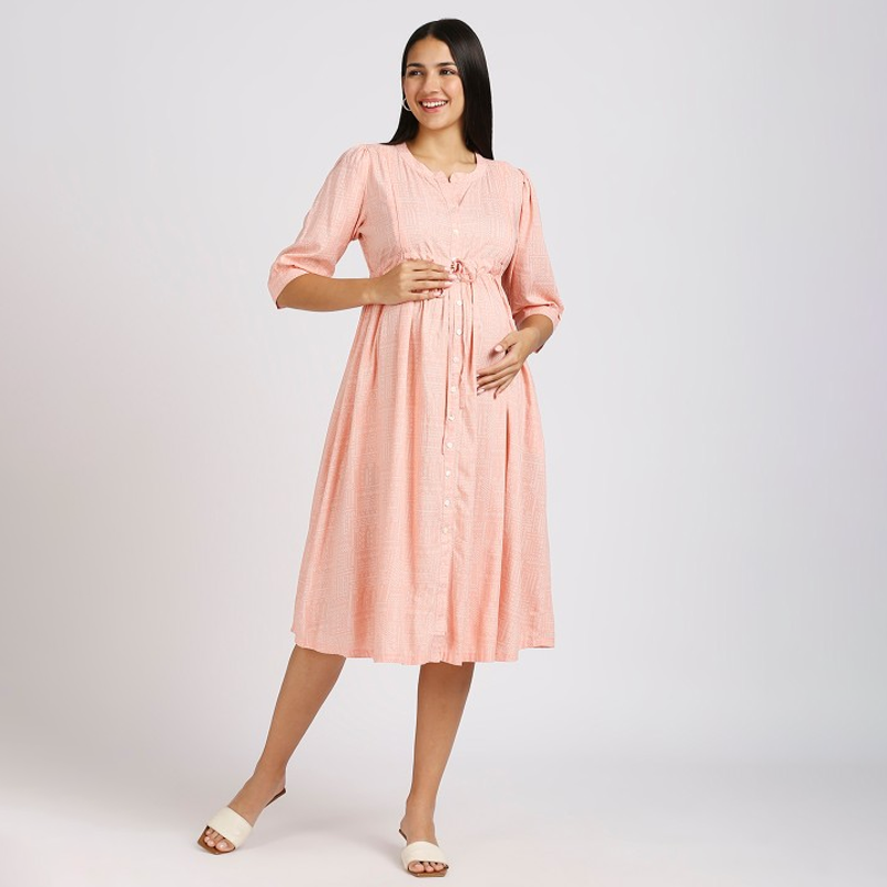 Checked Puff Sleeves Maternity Fit & Flare Dress