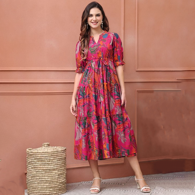 Abstract Printed Sweetheart Neck Cuffed Sleeves Gathered Tiered Georgette Maxi Dress